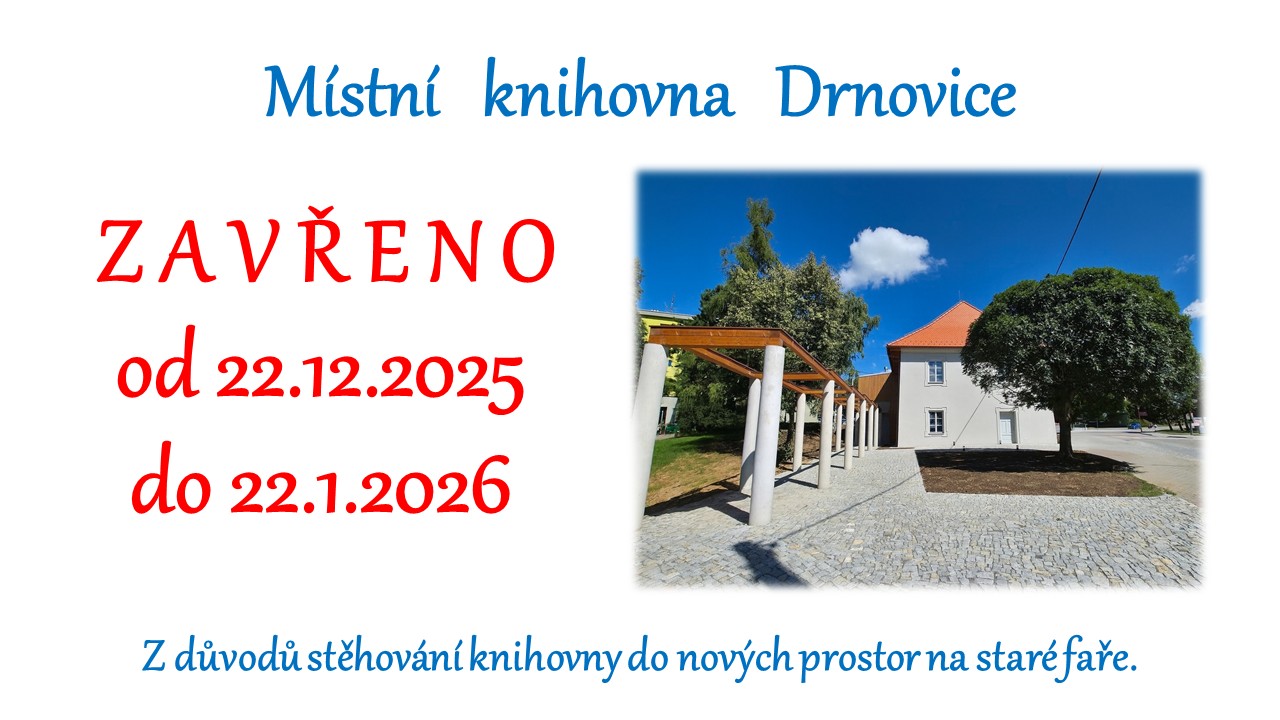 Místní knihovna Drnovice bude od 22.12.2025 do 22.01.2026 zavřená, z důvodu stěhování knihovny do nových prostor na staré faře. Děkujeme za pochopení.